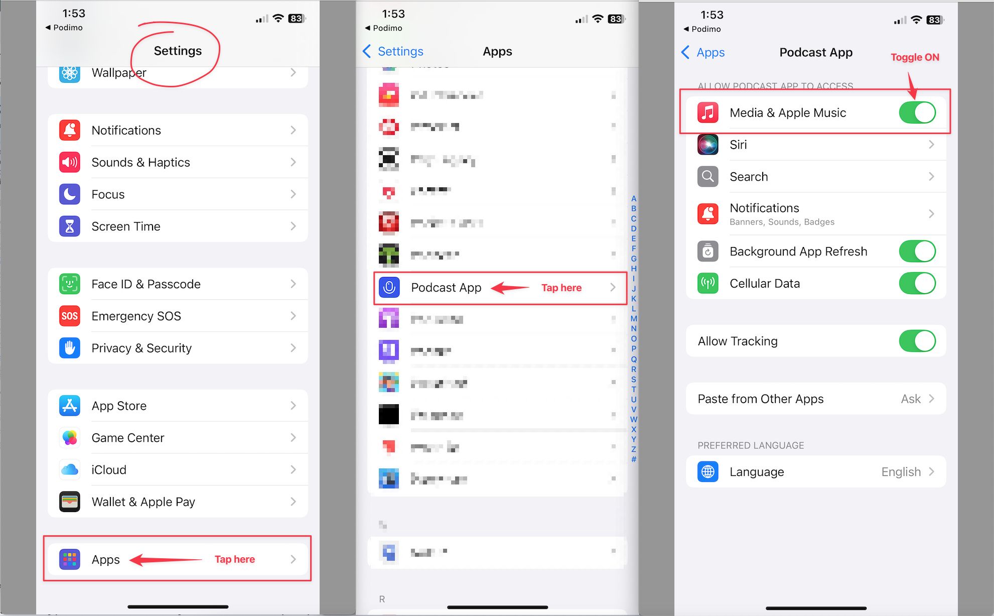 "Permission needed - Go to Settings and allow Podimo to access your Media Library", please follow these steps: